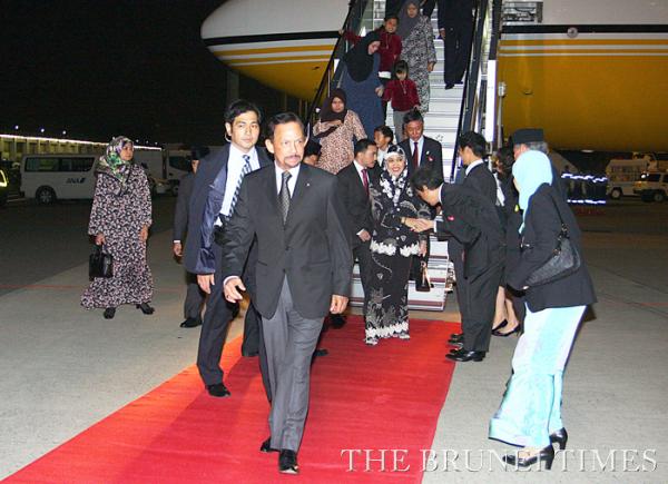 พระราชาธิบดีและพระราชินีแห่งบรูไน ได้เสด็จเยือนประเทศญี่ปุ่น พร้อมทั้งรัฐมนตรีกระทรวงการต่างประเทศและการค้าคนที่ 2 และทูตบูรไนประจำประเทศญี่ปุ่น โดยเสด็จถึงท่าอากาศยานนานาชาติโตเกียวเมื่อวันที่ 12 พฤษภาคม โดยมีรัฐมนตรีช่วยว่าการกระทรวงการต่างประเทศญี่ปุ่น นายเคนตะ วากาบายาชิ และทูตญี่ปุ่นประจำบรูไนให้การต้อนรับ