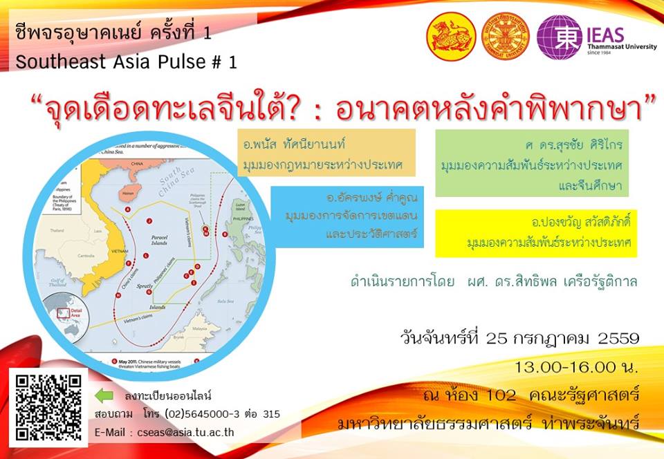 ศูนย์เอเชียตะวันออกเฉียงใต้ สถาบันเอเชียตะวันออกศึกษา ร่วมกับคณะรัฐศาสตร์ มหาวิทยาลัยธรรมศาสตร์จัดสัมมนาในซีรีส์ชีพจรอุษาคเนย์  (Southeast Asia Pulse) ครั้งที่ 1 เรื่อง “จุดเดือดทะเลจีนใต้? : อนาคตหลังคำพิพากษา” ขึ้นเมื่อช่วงบ่ายวันที่ 25 กรกฎาคม 2559 ณ ห้อง ร. 102 คณะรัฐศาสตร์ มหาวิทยาลัยธรรมศาสตร์ โดยมีวิทยากรผู้เชี่ยวชาญ 4 ท่านมาร่วมอภิปราย และมี ผศ.ดร.สิทธิพล เครือรัฐติกาล เป็นผู้ดำเนินรายการ